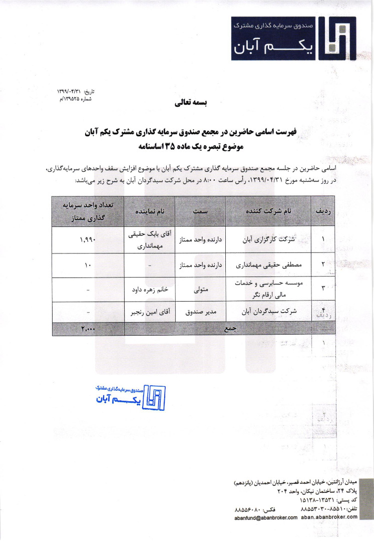 عنوان خبر فهرست اسامی حاضر در مجمع مورخ 1399/04/31 مربوط به افزایش سقف واحدهای سرمایه‌گذاری در صندوق