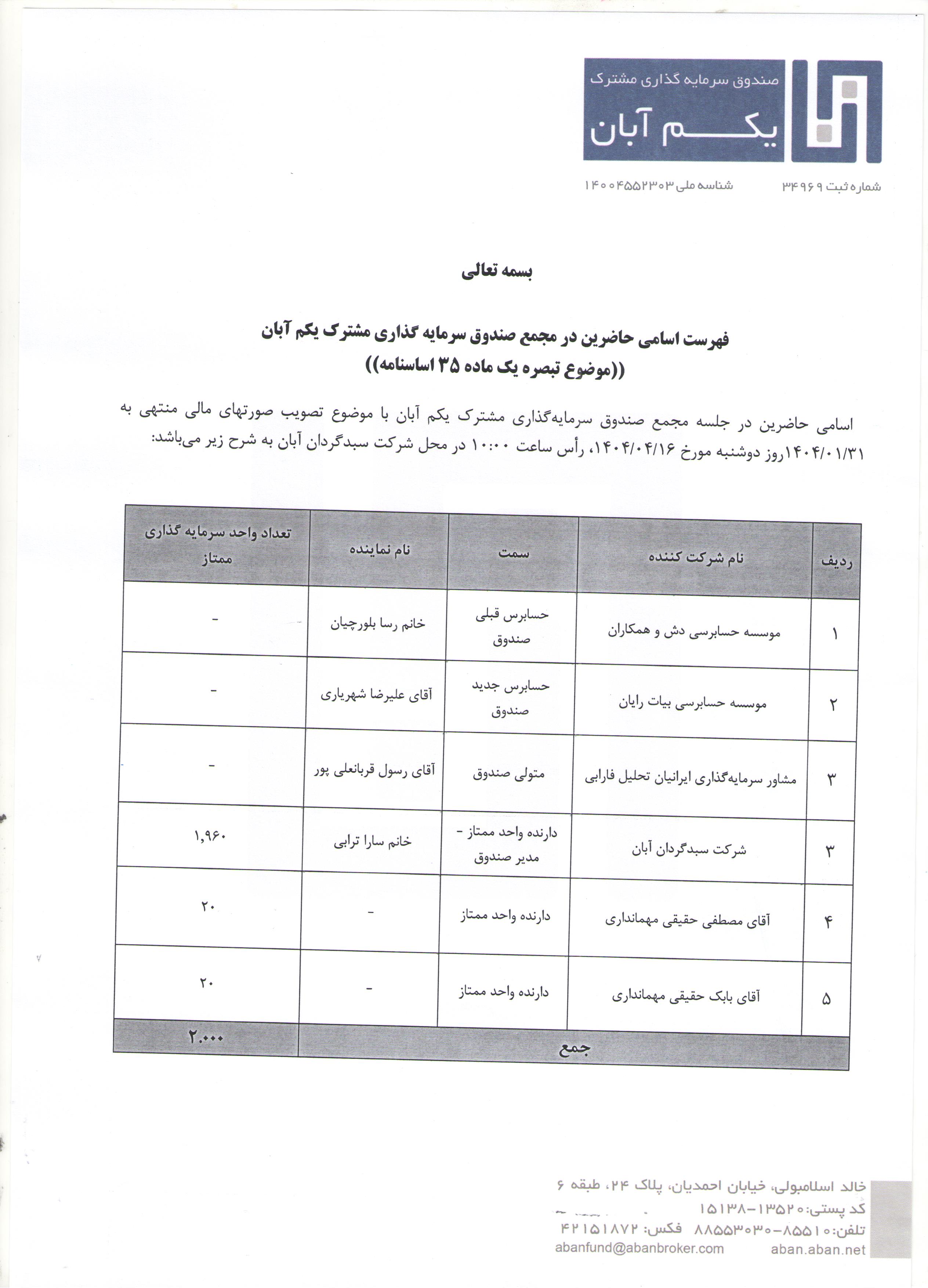 | مقدمه | اسامی حاضرین در مجمع صندوق سرمایه گذاری مشترک یکم آبان با موضوع تصویب صورت های مالی منتهی به 31 فروردین 1404 مورخ ۱۴۰۴/04/16 ساعت 10:۰۰ |
